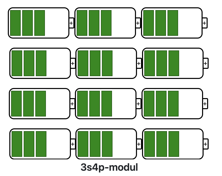 För att beräkna batteripaketets bruttostorlek, multiplicera den totala parallella kapaciteten i Ah (ampere-timmar) med batteripaketets nominella spänning i volt. Resultaten är i WH wattimmar.